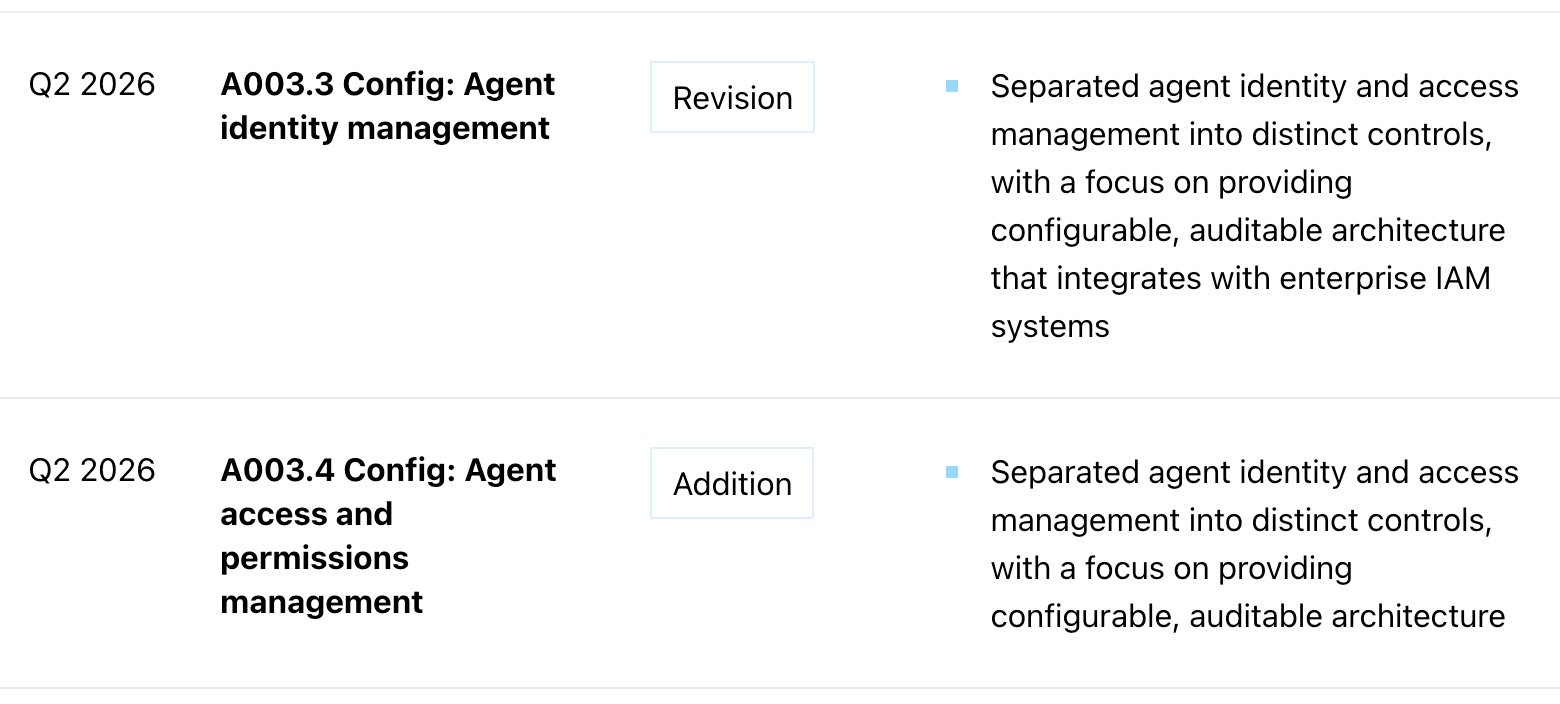 The Q2 update introduced foundational controls for agent identity (A003.3) and permissions (A003.4), in mandating AI agent companies enable agent identity and access management through building permission ready architecture.