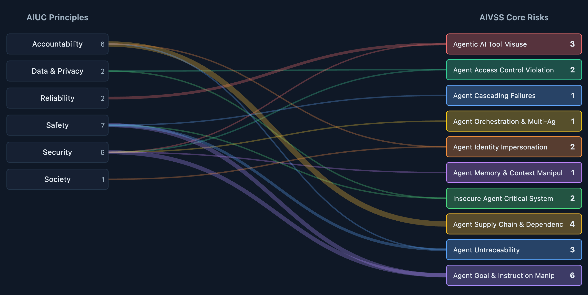 AIUC-1 - the standard for AI agent safety, security, and reliability - offers a comprehensive list of controls, enabling security leaders to quickly move from risk identification to risk mitigation. Because both AIUC-1 and the AIVSS are focused on AI agents specifically, the risks map directly to controls and doesn’t require an additional layer of translation.